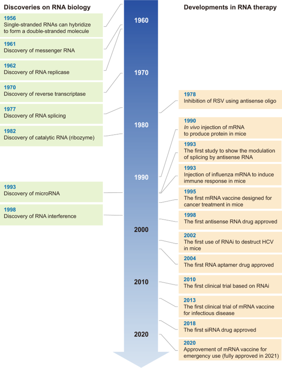 The first use case of RNA as therapeutics was demonstrated in the late 1970s, Zamecnik & Stephenson demonstrated the potential of RNA antisense oligonucleotide (ASO) therapy. The duo showed that the synthesized ASOs were able to inhibit Rous sarcoma virus replication, by inhibiting viral protein translation. This was followed by the use of mRNAs for protein expression, RNAi for translation inhibition, and further developments in other formats. The development timeline for RNA modalities can be seen below.