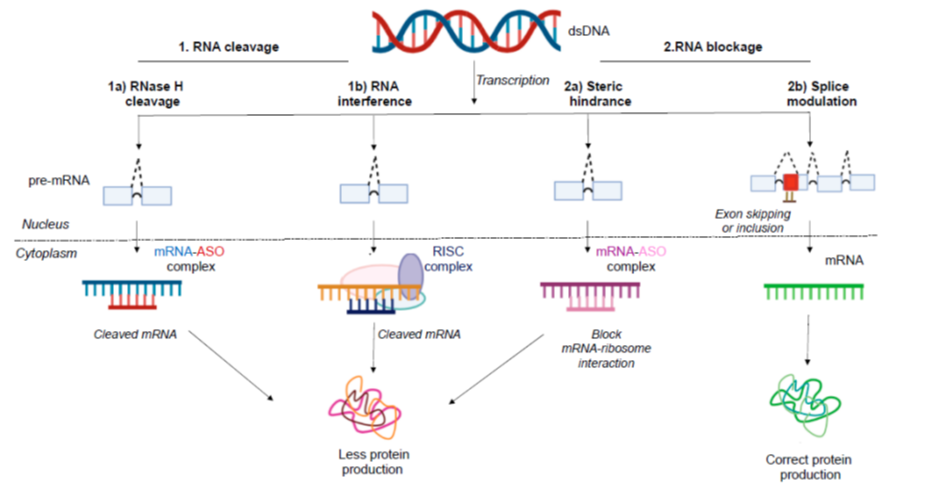 Because RNAi makes use of double-stranded molecules, these therapies are tougher to get into cells compared to ASOs. But fewer molecules are needed for the therapy to be effective.