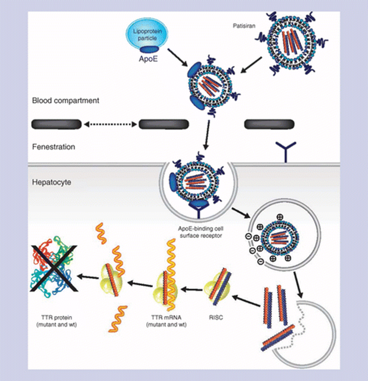 RNAi involves small interfering RNAs (siRNAs), 21–23 nucleotides long, or similar molecules such as micro RNAs, to degrade mRNA and prevent them from being translated into protein. An example of siRNA therapy includes the other amyloidosis drug approved in 2018, Patisiran by Alnylam.