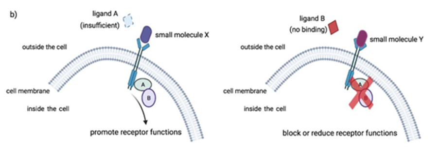 Small molecule drugs have a low molecular weight (small size), allowing them to penetrate cells easily. These compounds work by targeting key processes in molecular pathways to achieve their desired outcome. This could be by inhibiting intracellular enzymes, or by facilitating or blocking signal transductions. The images below explain these different mechanisms of action.